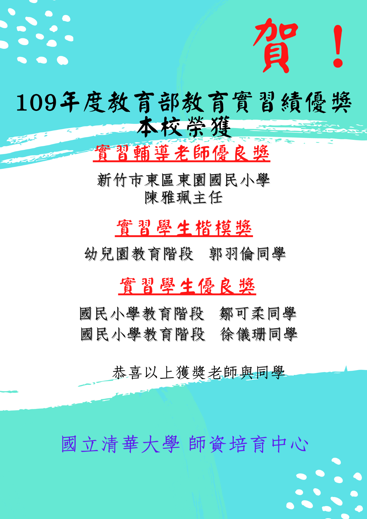 恭賀徐憶萍老師榮獲「109學年度校教師傑出教學獎」