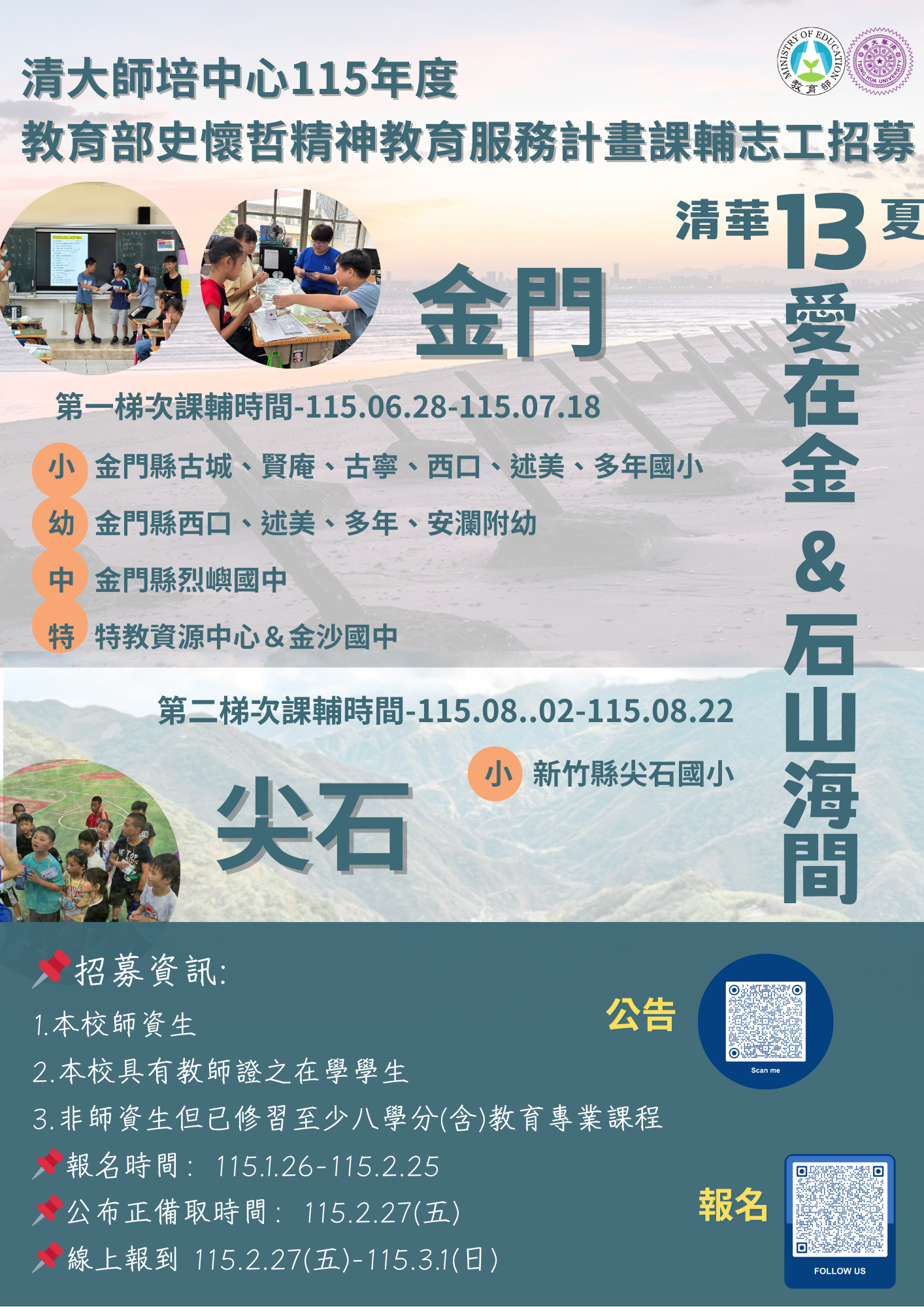 💗錯過前12年的你~新的開始歡迎加入我們史懷哲的大家庭->清大師培師資生成為一位正式老師的前哨站,邀請對教學有興趣、對美麗的金門與新竹原民尖石偏鄉有想去探究與服務的衝動,歡迎對志工服務有熱忱的你/妳一起來參與我們第13年的課輔