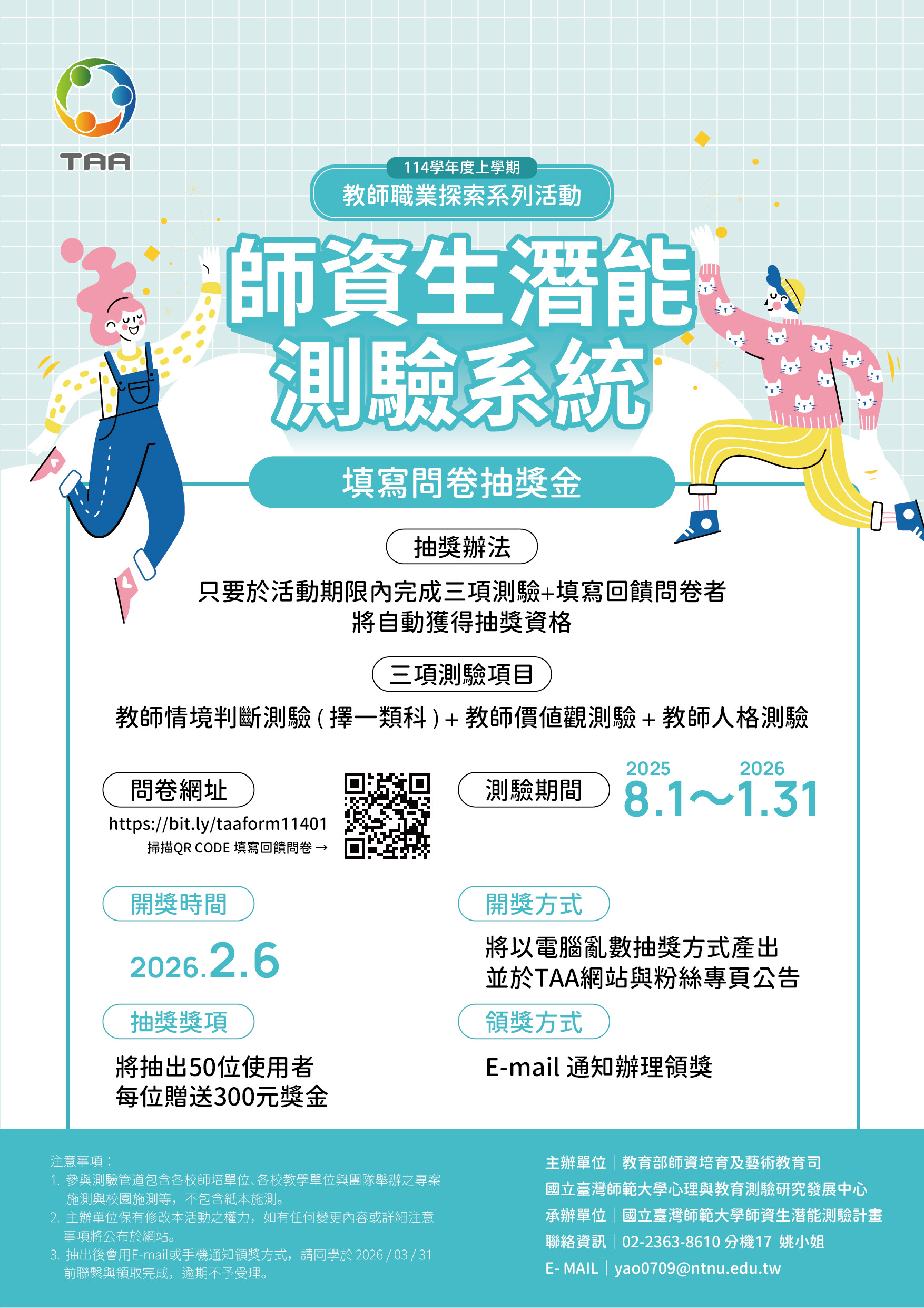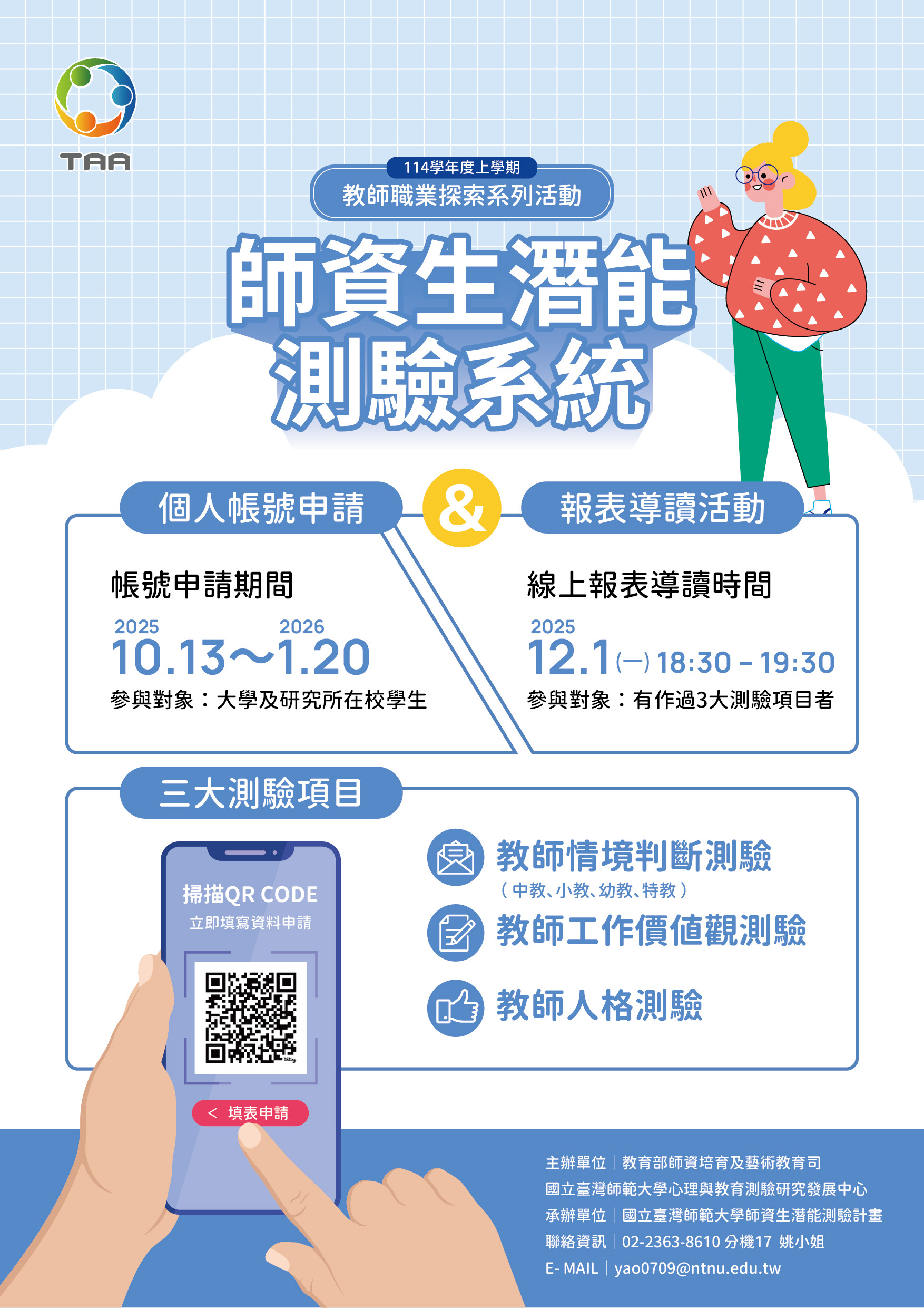 【轉知】臺師大辦理「師資生潛能測驗系統」之個人帳號申請與報表導讀活動(114-1)