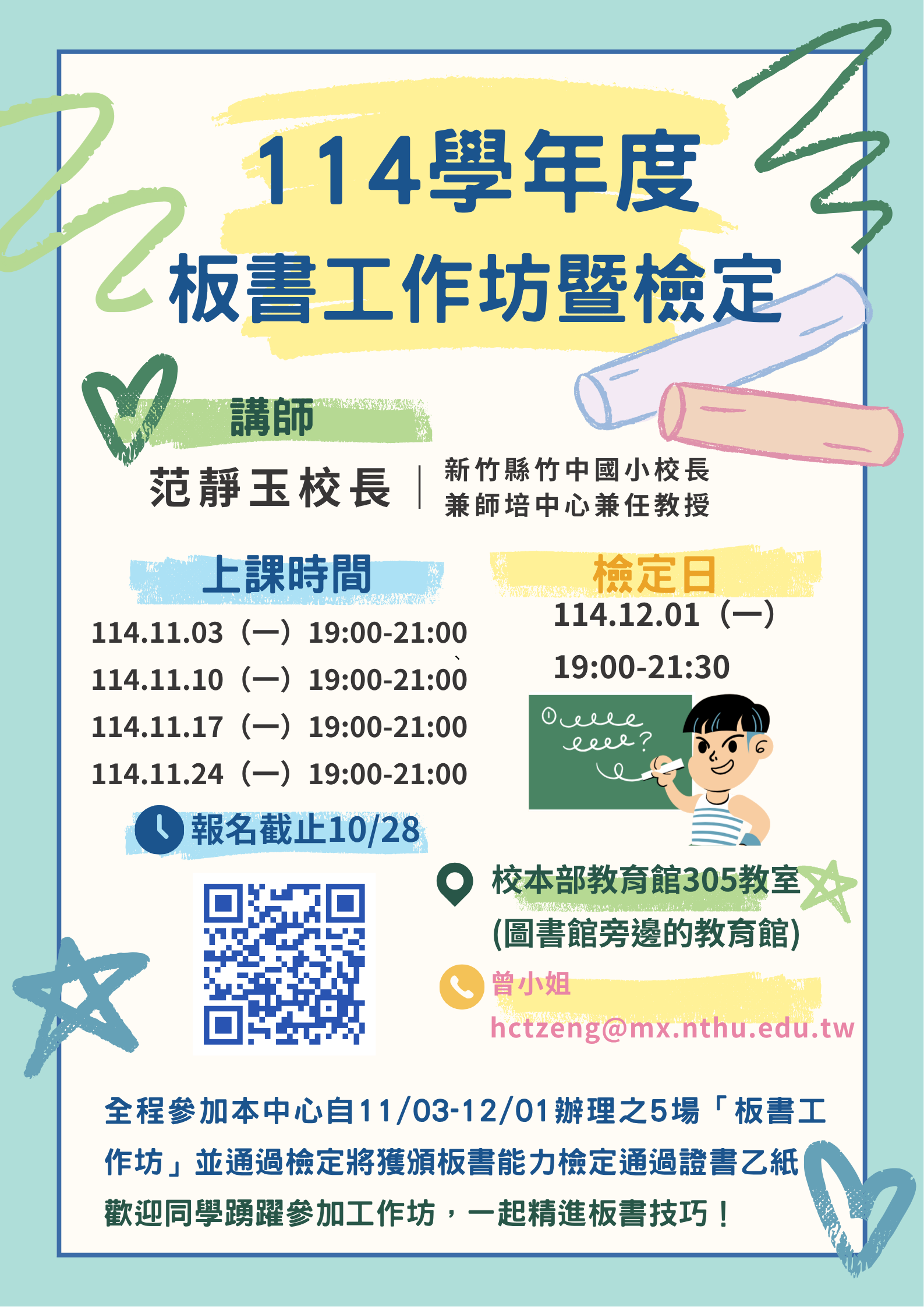 114學年度【板書工作坊暨檢定】歡迎同學踴躍參加!