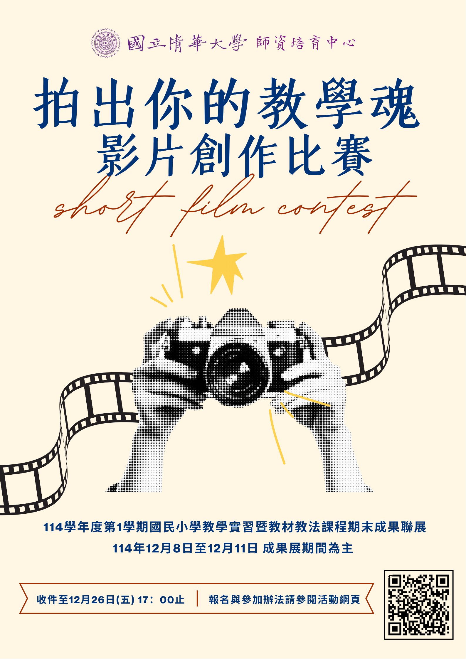 為鼓勵師資生以創意與多媒體方式記錄「114學年度第1學期國民小學教學實習暨教材教法課程期末成果聯展」歷程,展現教育現場的熱情、專業與反思,師資培育中心特舉辦「拍出你的教學魂!」影片創作比賽,邀請同學以鏡頭說故事,捕捉屬於清華師培的感動瞬間。